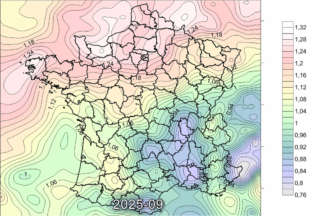 Cette carte est construite à partir des données de vitesses des 651 points de grille CFS de la fenêtre (-6°W – 9°E) x (42°N – 52°N). Sur chaque point de grille, la vitesse moyenne du vent du mois considéré est comparée à la moyenne sur la période long terme (2012-2023) des vitesses moyennes mensuelles du même mois, ce qui nous définit en chaque point de grille un index de vent. Pour les données CFS, qui ont remplacé les données CFSR début 2011, on ne peut remonter avant mars 2011 pour la période long terme.
