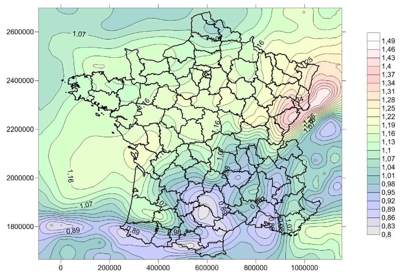 Des index de vent basés sur les données réanalysées CFS de NCEP vous sont proposés en début de chaque mois pour le mois précédent. La carte ci-dessous représente ainsi ces index de vent, sur la France entière, pour le mois de :